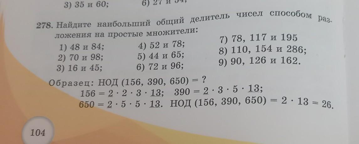 278. Найдите наибольший общий делитель ложения на простые множители: 84; 1) 48 2) 70 m 98: 3) 16 n 45; 4) 52 m 78: 5) 44 65; 96; 6) 72 способом pas 7) 78, 117 m 195 8) 110, 154 n 286; 9) 90, 126 n 162. 660) - ? 390-2-3-5-13: Образец: НОД (166, 390, 6502 5 5 13. Hод (156, 390, 650) 2 13 - 26, 166-2 2 3 13: - -