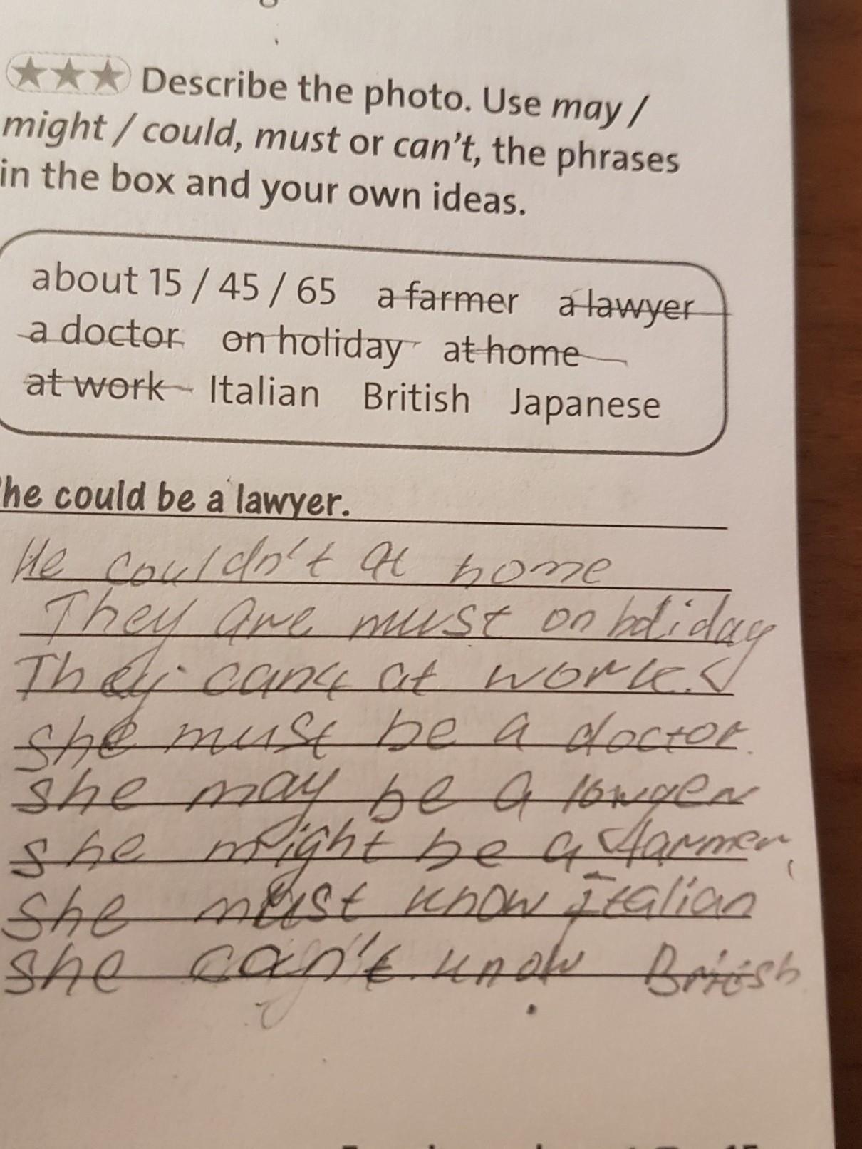 4 Describe the photo. Use may/ might/could, must or can't, the phrases in the box and your own ideas. about 15/45/65 a farmer a lawyer a doctor on holiday at home at work Italian British Japanese She could be a lawyer. 123d