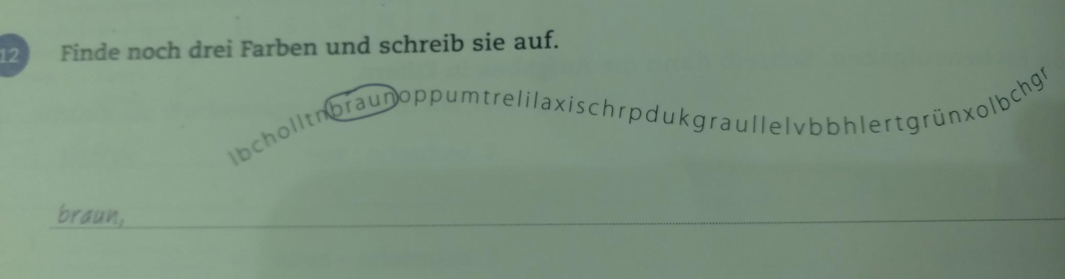 12 Finde noch drei Farben und schreib sie auf. ( Ibcholltnbraunoppumtrelilaxischrpdukgraullelvbbhlertgrünxolbchgr)
