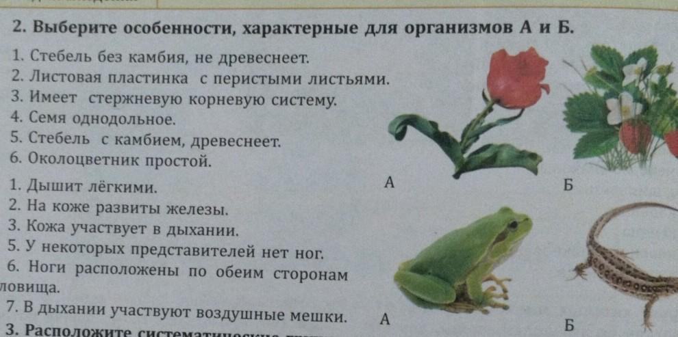 Выберите особенности, характерные для организмов А и Б. 1. Стебель без камбия, не древеснеет. 2. Листовая пластинка с перистыми листьями. 3. Имеет стержневую корневую систему. 4. Семя однодольное. 5. Стебель с камбием, древеснеет. 6. Околоцветник простой. 1. Дышит лёгкими. 2. На коже развиты железы. 3. Кожа участвует в дыхании. 5. У некоторых представителей нет ног. 6. Ноги расположены по обеим сторонам туловища. 7. В дыхании участвуют воздушные мешки. Пожалуйста помогите