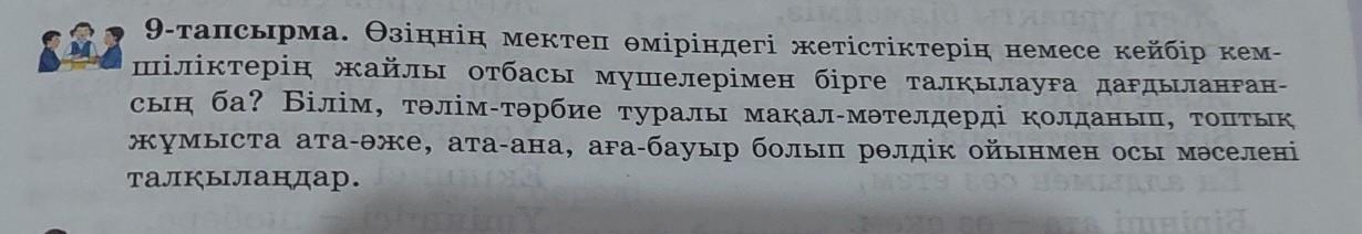 9-тапсырма. Өзіңнің мектеп өміріндегі жетістіктерің немесе кейбір кем- шіліктерің жайлы отбасы мүшелерімен бірге талқылауға дағдыланған- сың ба? Білім, тәлім-тәрбие туралы мақал-мәтелдерді қолданып, топтық жұмыста ата-әже, ата-ана, аға-бауыр болып рөлдік ойынмен осы мәселені талқылаңдар.