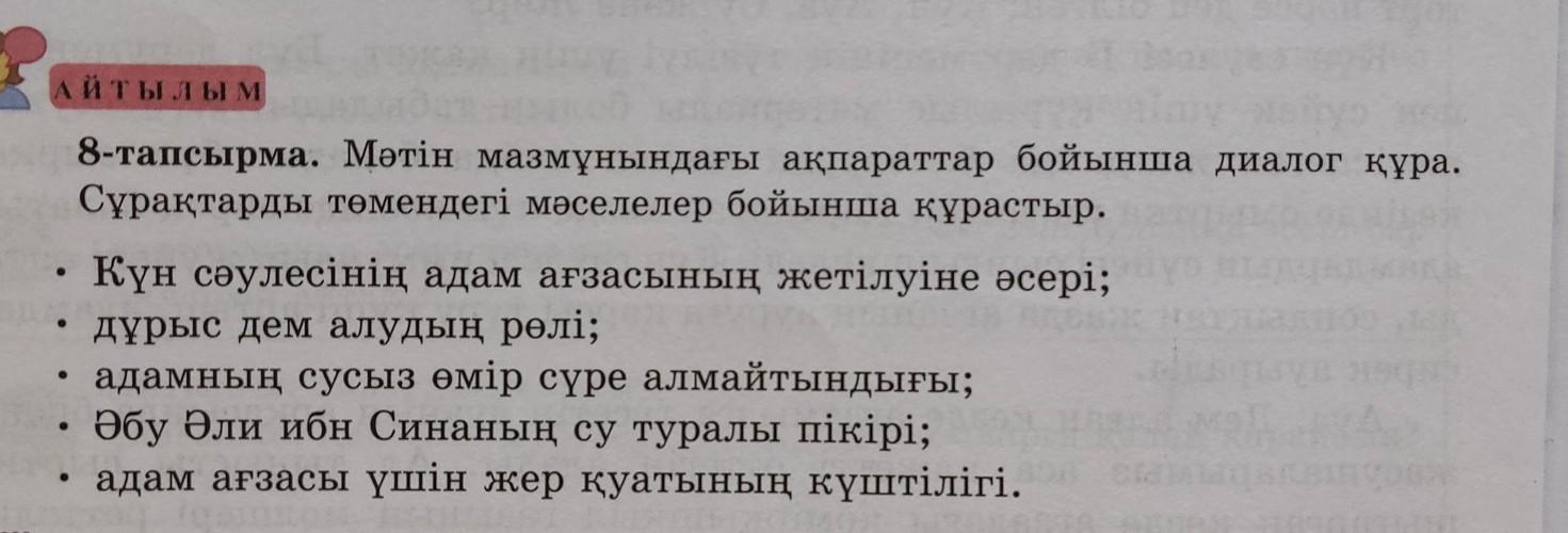 АЙТЫЛЫМ 8-тапсырма. Мәтін мазмұнындағы ақпараттар бойынша диалог құра. Сұрақтарды төмендегі мәселелер бойынша құрастыр. ● ● ● ● Күн сәулесінің адам ағзасының жетілуіне әсері; дұрыс дем алудың рөлі; адамның сусыз өмір сүре алмайтындығы; Әбу Әли ибн Синаның су туралы пікірі; адам ағзасы үшін жер қуатының күштілігі.