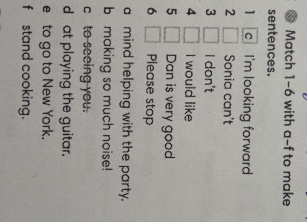 Match 1-6 with a-f to make sentences. 1 2 3 4 5 6 C I'm looking forward Sonia can't I don't I would like Dan is very good Please stop a mind helping with the party. making so much noise! b c to seeing you. d at playing the guitar. e to go to New York. f stand cooking.