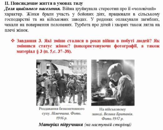 Зміни в побуті людей у роки Першої світової війни були значними і вплинули на всі сфери життя. Війна змусила людей пристосовуватися до нових умов, викликаних нестачею продуктів, ресурсів, грошей, житла, комунікацій та іншого.