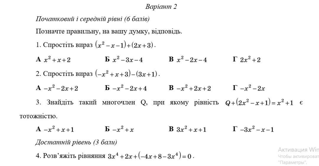 (сроооооочно)Варіант 2 Початковий і середній рівні (6 балів) Позначте правильну, на вашу думку, відповідь. 1. Спростіть вираз (x²-x-1)+(2x+3). A x² +x+2 Б x²-3x-4 2. Спростіть вираз (-x²+x+3)-(3x+1). A −x2-2x+2 Б -x²-2x+4 B -x² +2x+2 Г -x² - 2x 3. Знайдіть такий многочлен Q, при якому рівність Q+(2x²-x+1)= x2+1 € тотожністю. Б -x2 + х B x²-2x-4 B 3x²+x+1 A -x² +x+1 Достатній рівень (3 бали) 4. Розв'яжіть рівняння 3x4 +2x+(-4x+8-3x²)=0. Г 2x² +2 Г -3x²-x-1 Активация И Чтобы активиро "Параметры",(Можете посмотреть на фото будет понятней)