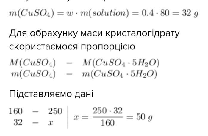 Обчисліть масу (г) купрум(ІІ) сульфат пентагідрату, який використали для приготу вання розчину масою 80 г з масовою часткою CuSO, 40%.