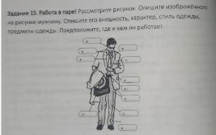Задание 15. Работа в паре! Рассмотрите рисунок. Опишите изображённого На рисунке мужчину. Опишите его внешность, характер, стиль одежды, Предметы одежды. Предположите, где и кем он работает.