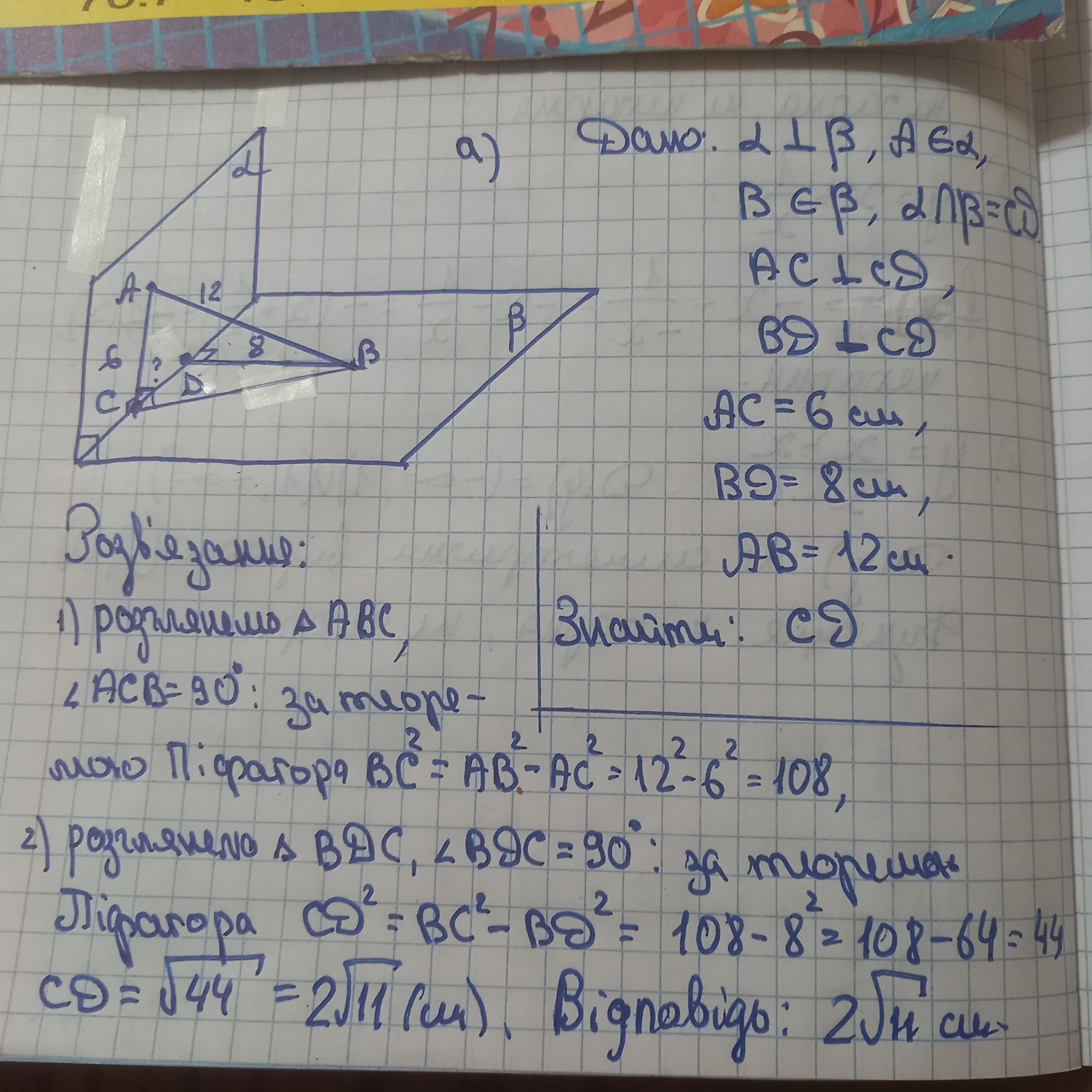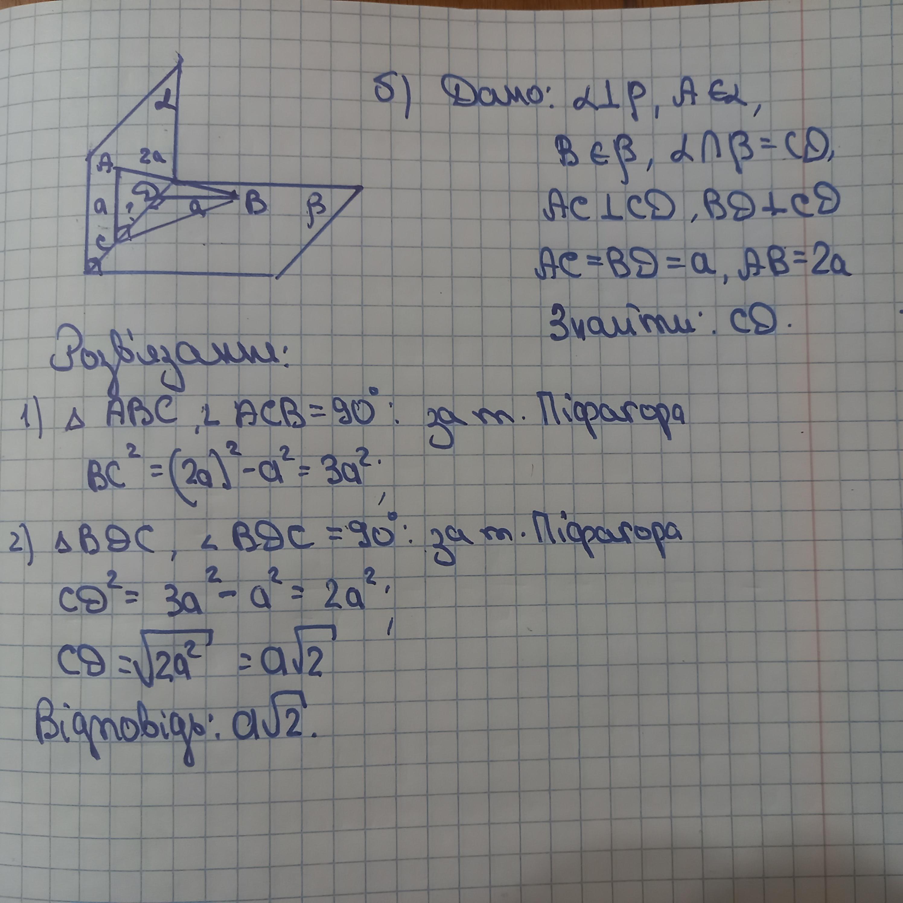Кінці відрізка AB лежать у перпендикулярних площинах. AC і BD — перпендикуляри, проведені до лінії перетину цих площин. Знайдіть CD, якщо: а) AC = 6 см, BD = 8 см, AB = 12 см; б) AC = BD = a, AB = 2a. з малюнком
