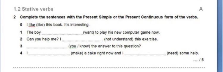 1. The boy doesn't understand this exercise. 2. Do you know the answer to this question? 3. I'm making a cake right now and I need some help. 4. Can you help me? I want to play his new computer game now.