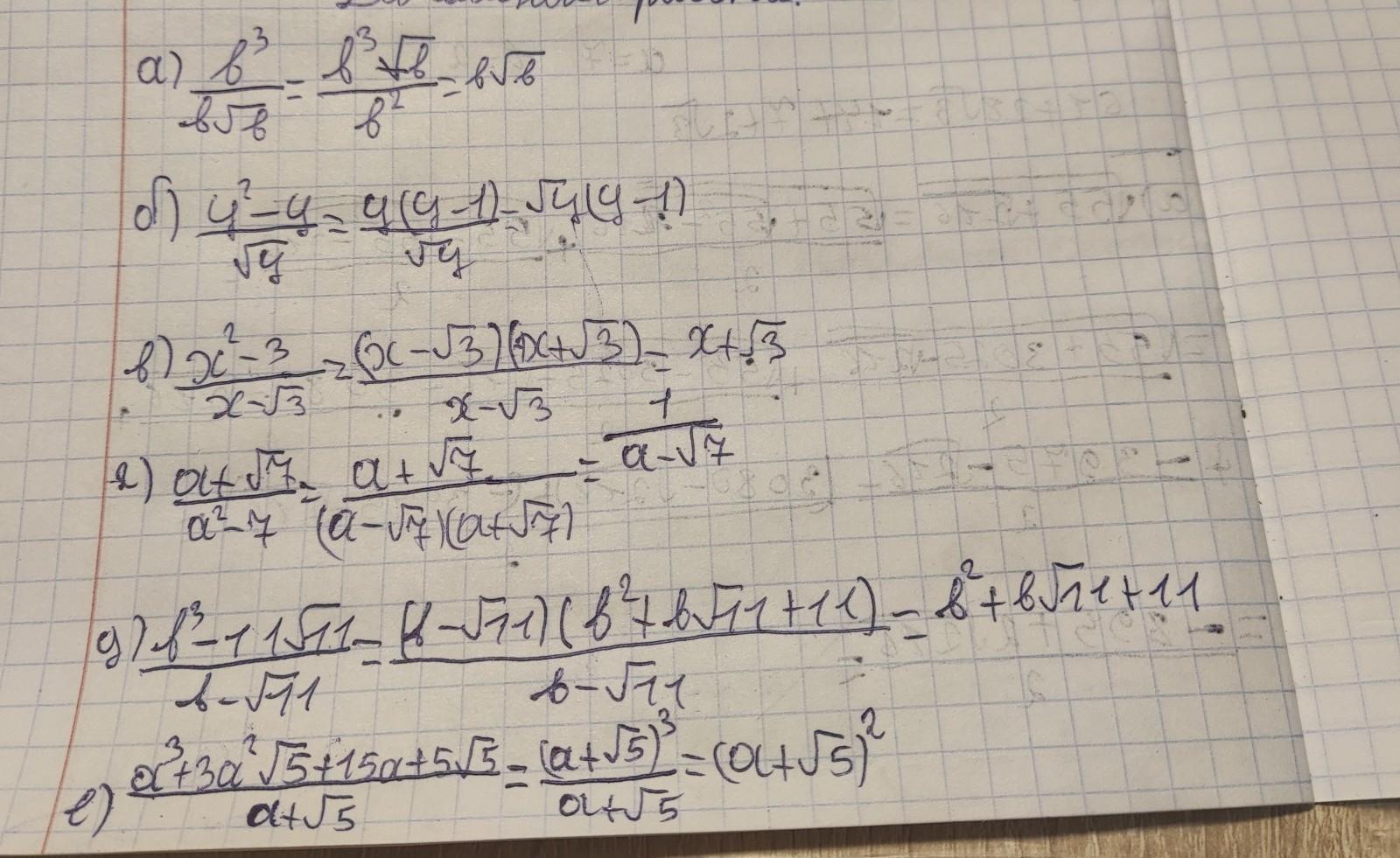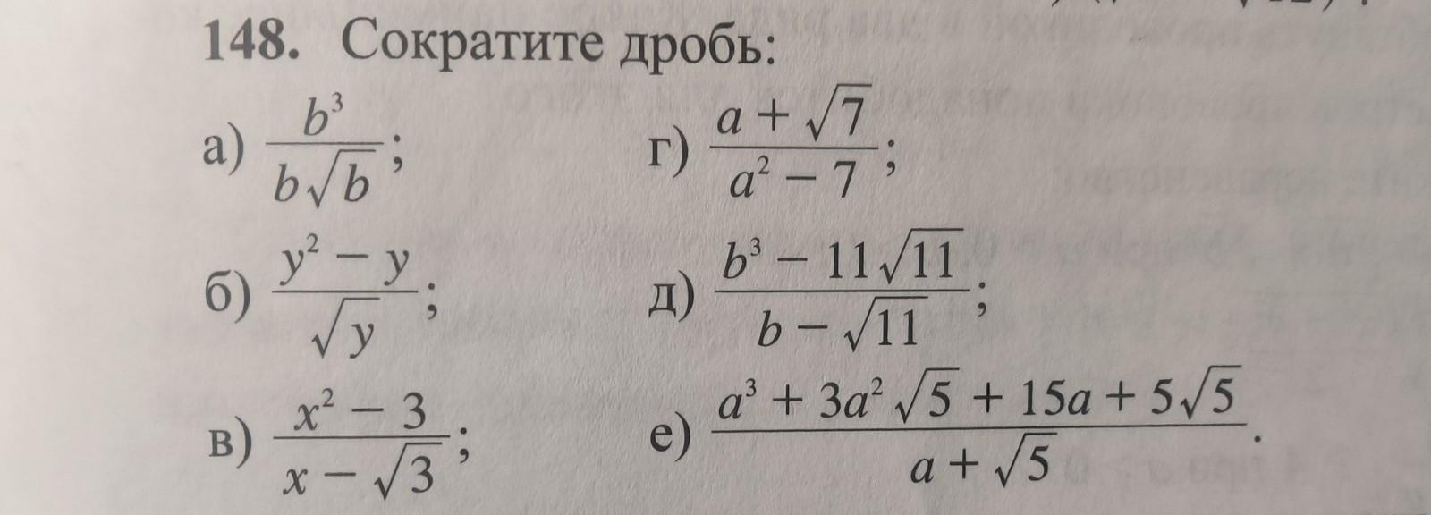 148. Сократите дробь: a) б) b3 b√b; B) у2 - у √y x² - 3 x-/3 r) a+/т a²-7; д) e) В - 11 /П. b- /11 a³ + 3a² /5 + 15a +5 / 5 a + / 5 ца: