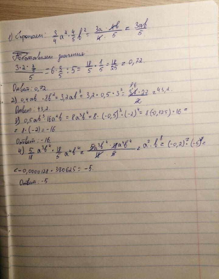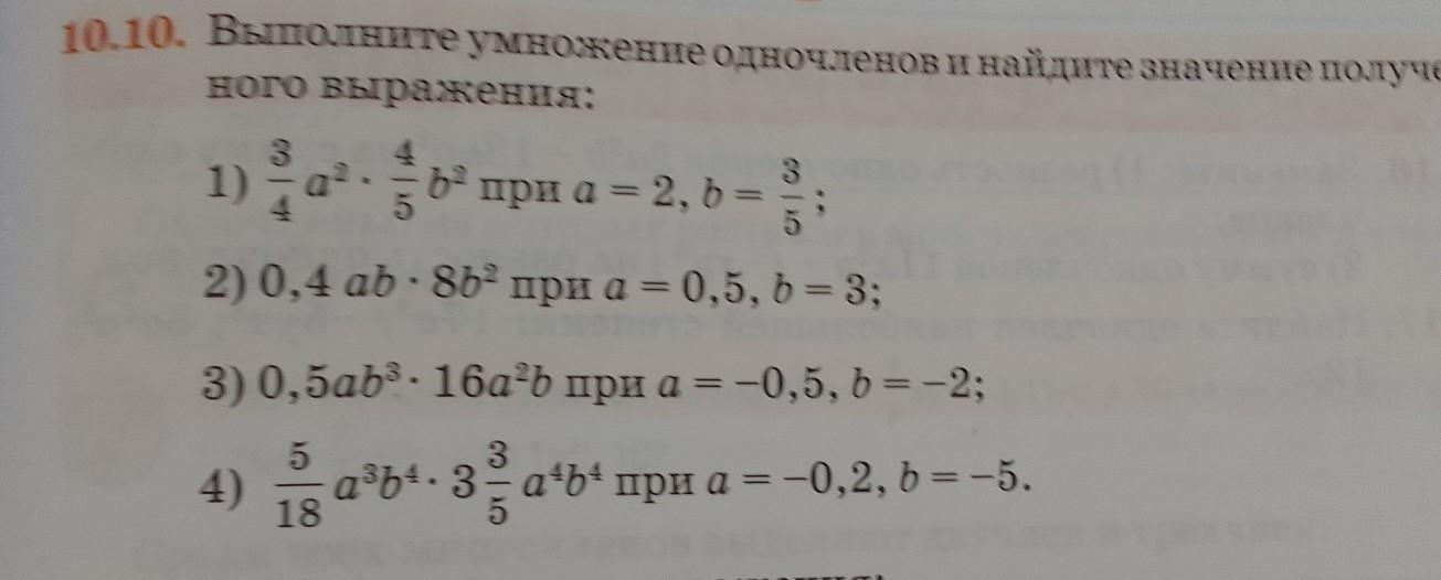 10.10. Выполните умножение одночленов и найдите значение получен- ного выражения: 3 4 3 1) а².5 ь при а = 2, b = = 5' 2) 0,4 aь. 802² при а = 0,5, b = 3; = 3) 0,5ab³. 16a²b при а = -0,5, b = -2; 3 4) a³b4 · 3 - a^b при а = -0,2, b = -5. 5 18 дам 20 баллов пожалуйста АААААА