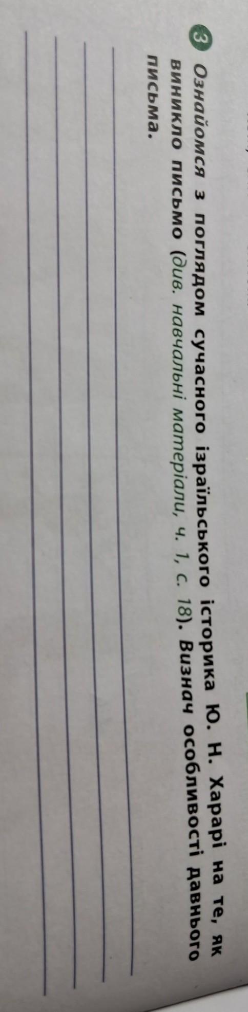 3 Ознайомся з поглядом сучасного ізраїльського історика Ю. Н. Харарi на те, як виникло письмо (див. навчальні матеріали, ч. 1, с. 18). Визнач особливості давнього письма.