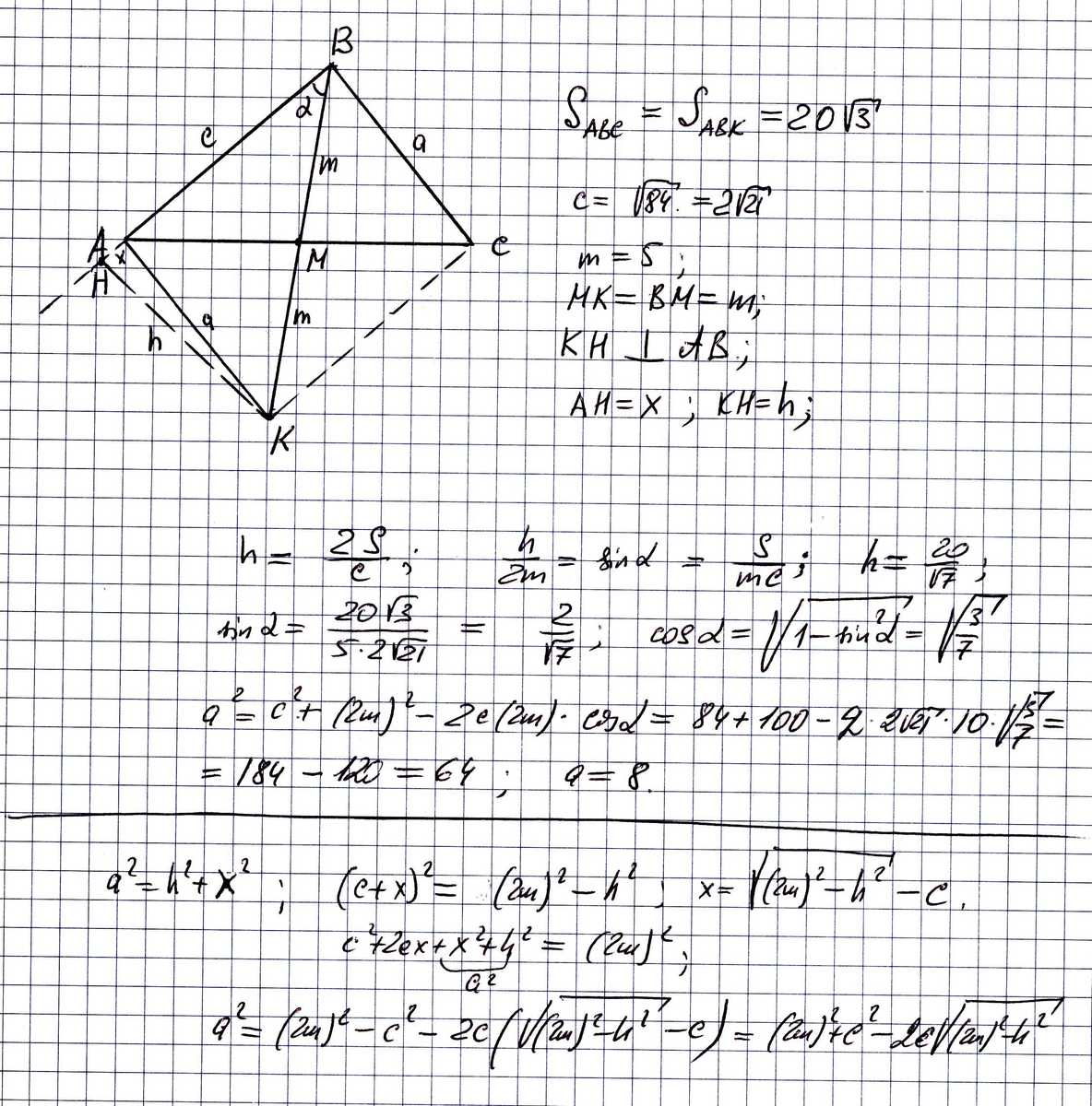 В треугольнике ABC сторона AB равна корень(84), и она больше половины АС. Найдите сторону ВС, если медиана ВМ равна 5, а площадь треугольника АВС равна 20корень(3)