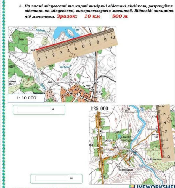 На плані місцевості та карті виміряні відстані лінійкою, розрахуйте відстань на місцевості, використовуючи масштаб. Відповіді запишіть
