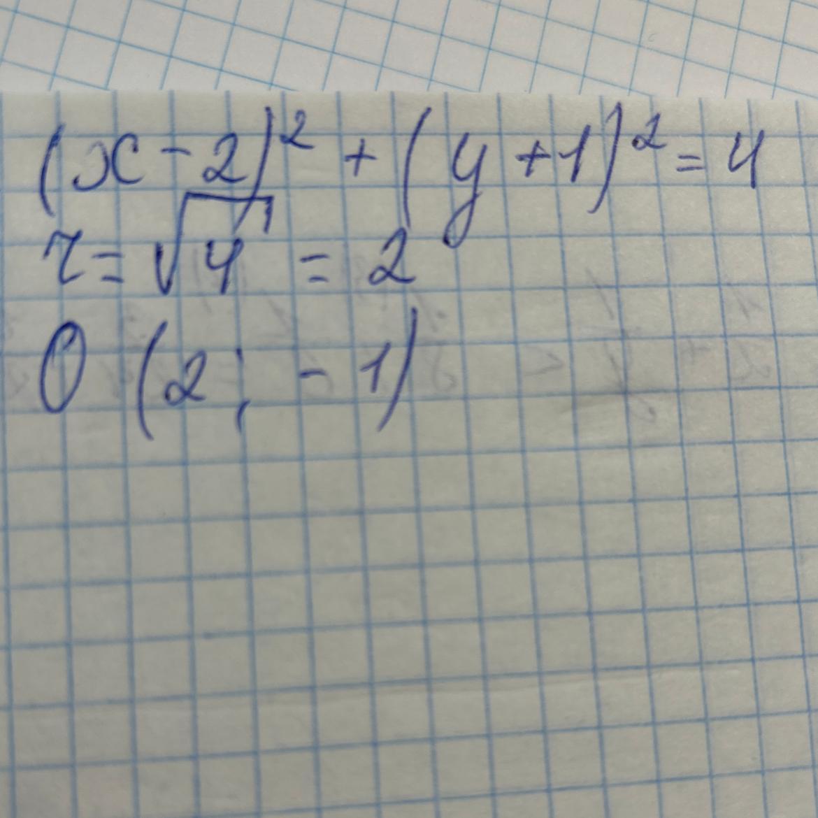 1.Знайдіть координати центра кола, заданого рiвнянням (x-2)2 +(y + 1)2=4. Вкажіть радіус цього кола.