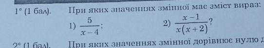 1° (1 бал). При яких значеннях змінноï має зміст вираз: 5 x-1 2) x(x + 2) 1) X- 4 ? тріб