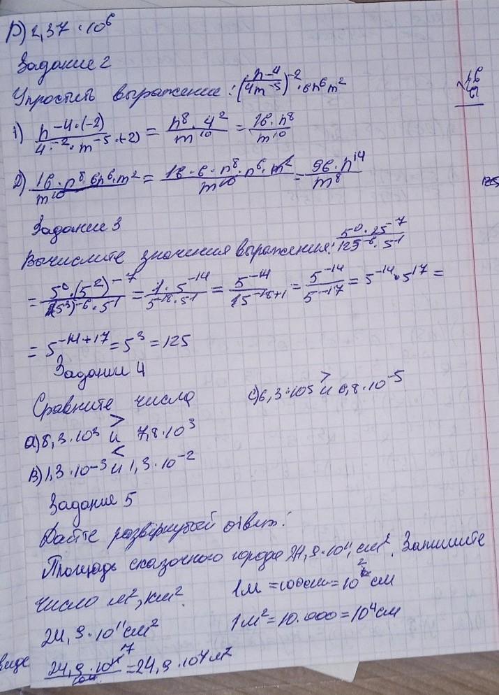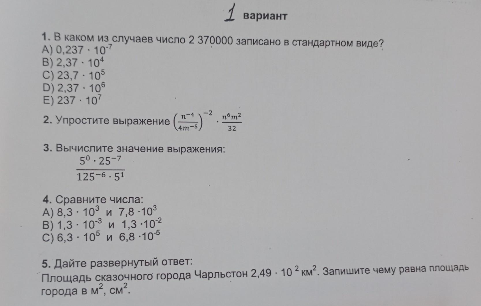 1 вариант 1. В каком из случаев число 2 370000 записано в стандартном виде? A) 0,237 · 10-7 B) 2,37 - 104 C) 23,7 - 105 D) 2,37 - 106 E) 237 - 107 2. Упростите выражение n-4 4m-5 4. Сравните числа: A) 8,3 10³ n 7,8-10³ B) 1,3 . 10-3 и 1,3-10-² C) 6,3-105 и 6,8 -105 -2 nom2 32 3. Вычислите значение выражения: 5⁰ 25-7 125-6.51 5. Дайте развернутый ответ: Площадь сказочного города Чарльстон 2,49. 10² км². Запишите чему равна площадь города в м², см².