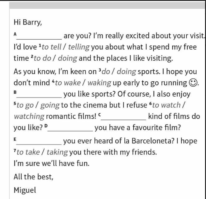 As you know, I'm keen on doing sports I hope you don't mind to wake up early to go running. (B)Do you like sports? Of course, I also enjoy going to the cinema but I refuse to watch romantic films! (C)What king of films do you like? (D)Do you have a favourite film? Did you ever heard of la Barceloneta? I hope to take you there with my friends. I'm sure we'll have fun.