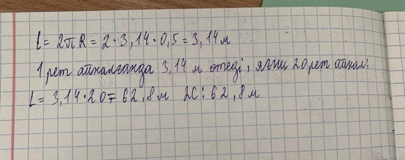3. Арба дөңгелегiнiн радиусы 0,5м болса, осы дөңгелек 10 рет неше метр жол жүредi? Мұндағы п≈ 3,14. айналганда [3]