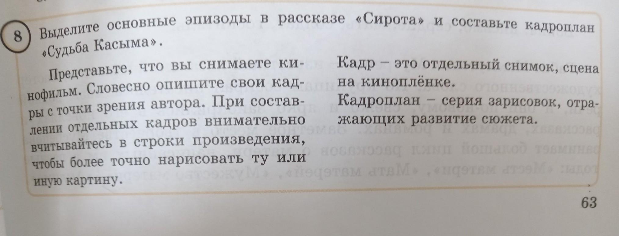 8 Выделите основные эпизоды в рассказе «Сирота» и составьте кадроплан «Судьба Касыма». Представьте, что вы снимаете ки- нофильм. Словесно опишите свои кад- ры с точки зрения автора. При состав- лении отдельных кадров внимательно вчитывайтесь в строки произведения, чтобы более точно нарисовать ту или иную картину. Кадр - это отдельный снимок, сцена на киноплёнке. Кадроплан серия зарисовок, отра- жающих развитие сюжета.