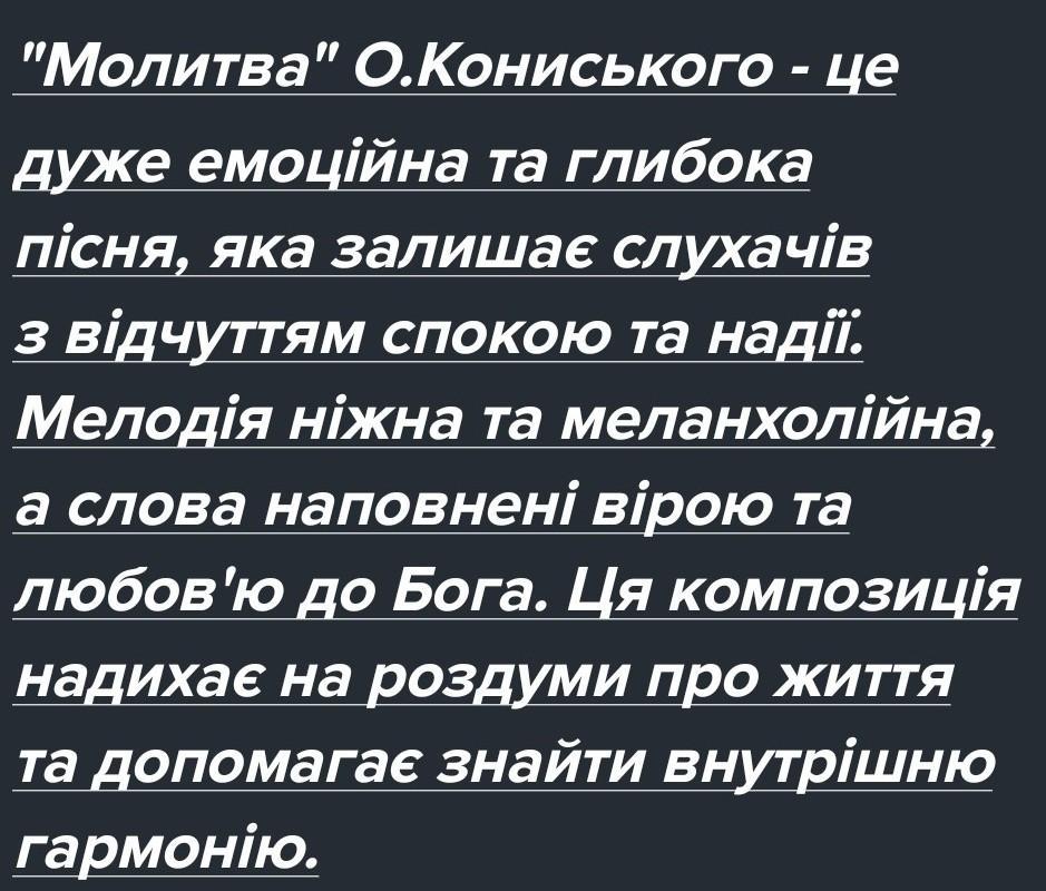 Напишіть вільне есе про враження від змісту пісні Олександра Кониського «Молитва». Обсяг до 10 речень.