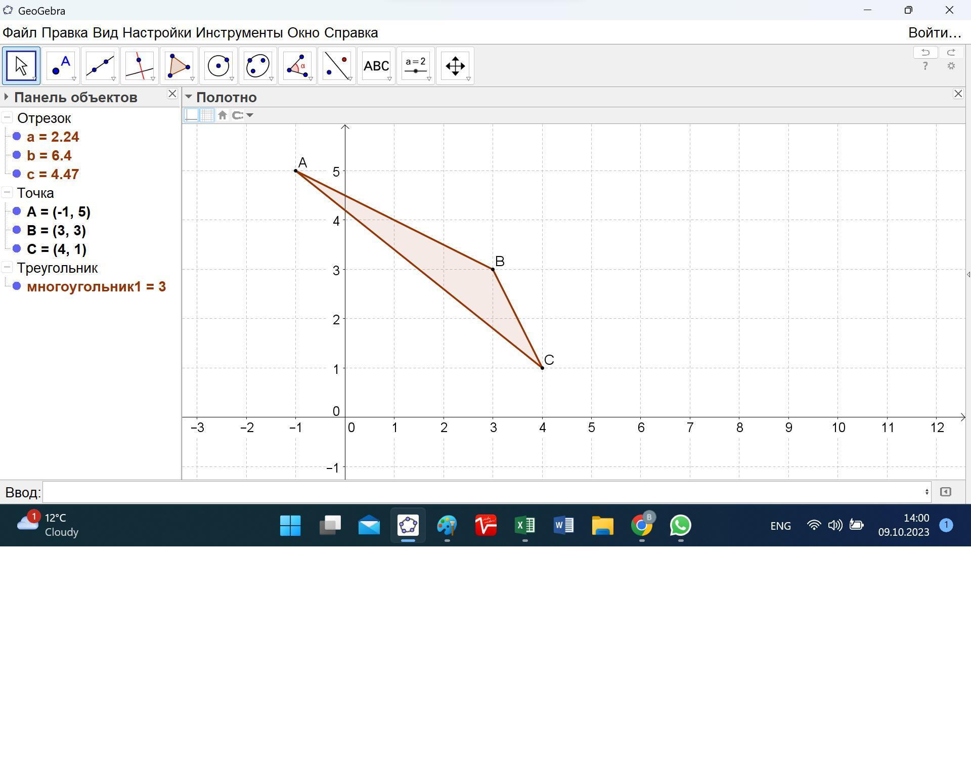 Начертите треугольник, вершины которого находятся в точках A(-1; 5), B(3; 3), С(4; 1), и вычислите его площадь.
