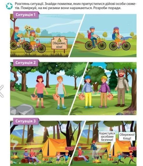 1 на мою думку вони ризикують попасти на міни на другому малюнку до чого не написано не якого попередження тому вони їдуть.2 на мою думку вони ризикують заблудитися без дорослих і зробити вред тварини на другому малюнку вони вже з дорослими вони не ризикують заблудитися але може статися те що там є погані гриби.3 на першому малюнку їм нічого не загрожує вони граються все добре але другому малюнку їх може вкусити кліщ але їм це сказали.