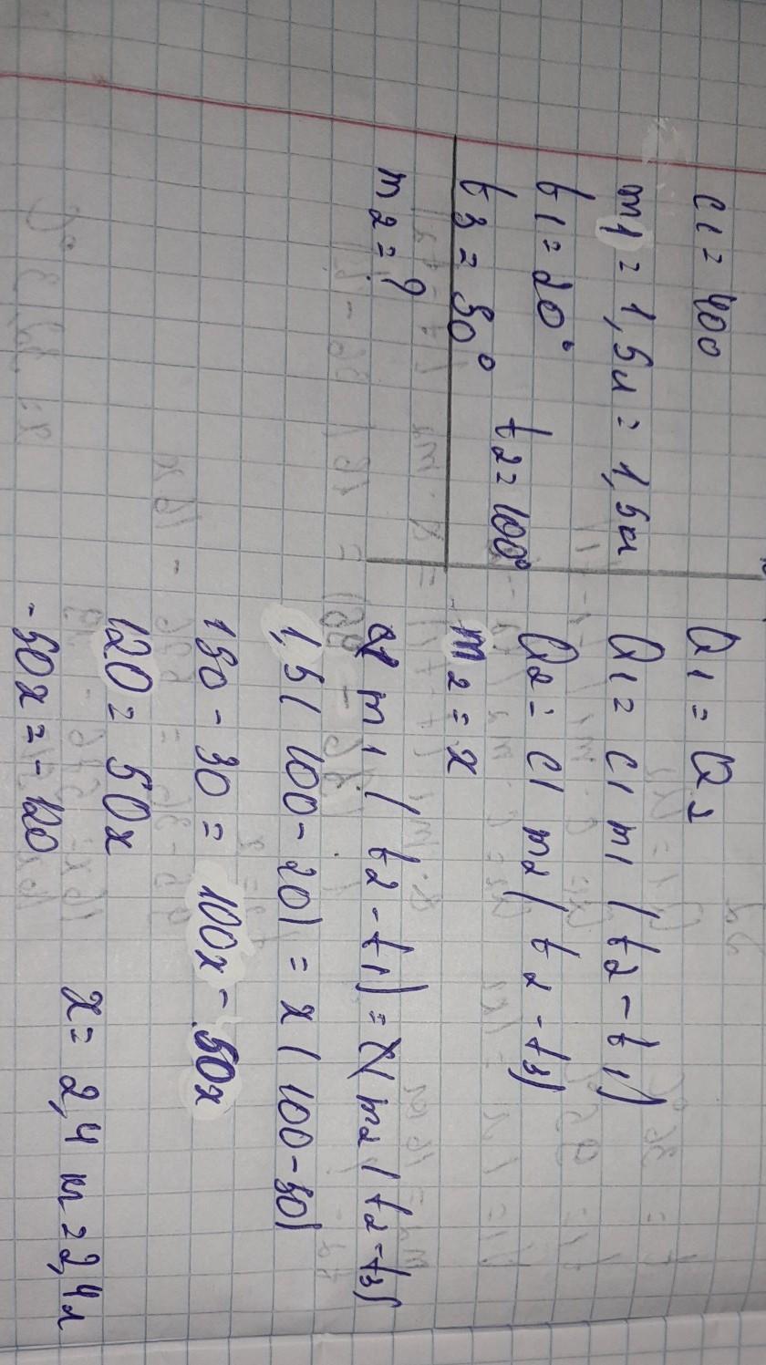 СРОЧНО Мідна каструля масою 400 г містить 1,5 л води при 20°С. Яку кількість окропу треба долити в каструлю, щоб температура води стала 50 °С?