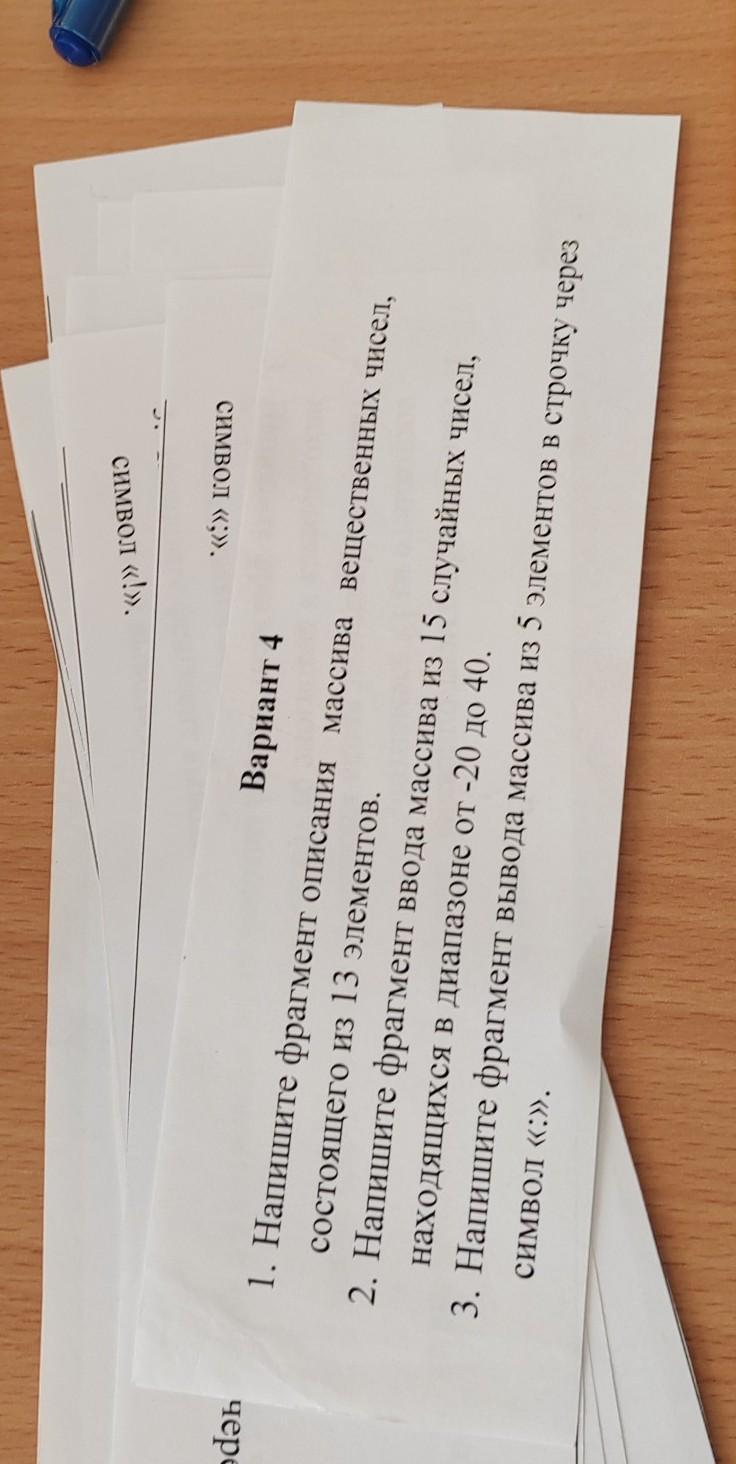 1. Напишите фрагмент описания постоянного массива из 5 целых находящихся в диапазоне от 5 до 30. элементов, значения которых соответствуют числам: 17, 23, 4, 26, 12. 2. Напишите фрагмент ввода массива из 10 случайных чисел,