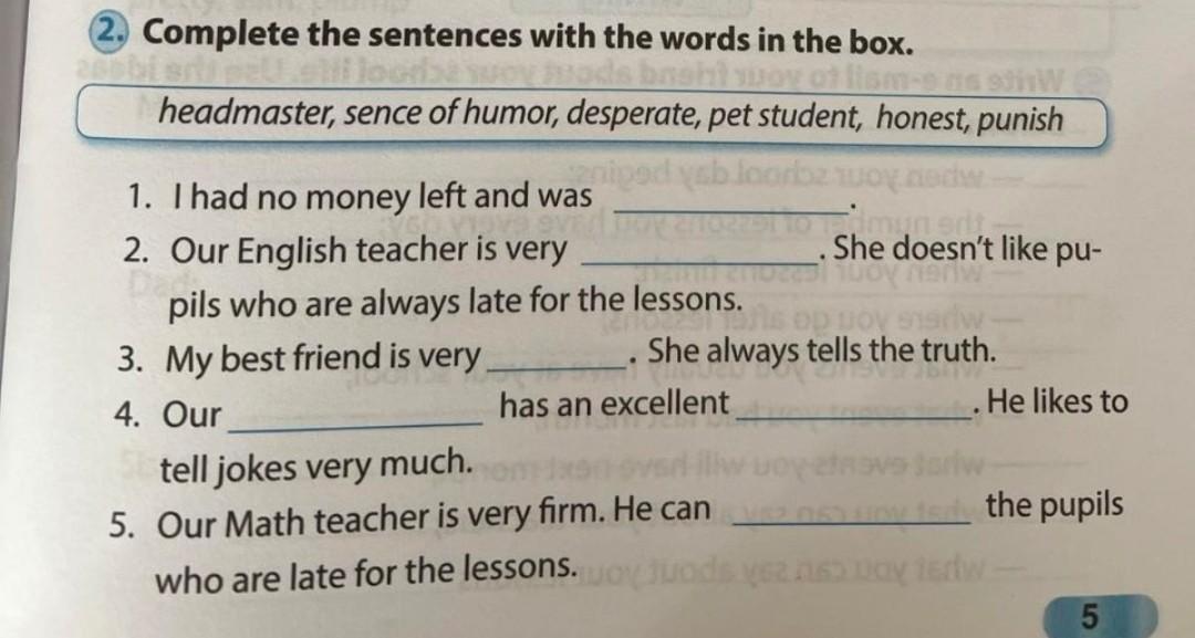 Ответ:1.Sence of humor 2.headmaster 3.pet student, punish 4.desperate 5.honest.