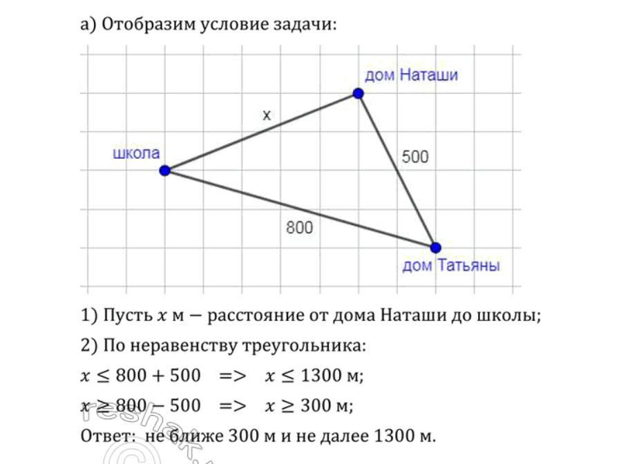 Будинок Тетяни розташовано на відстані 800 м від школи та 500 м від будинку Наталі. На якій відстані від школи знаходиться будинок Наталi?