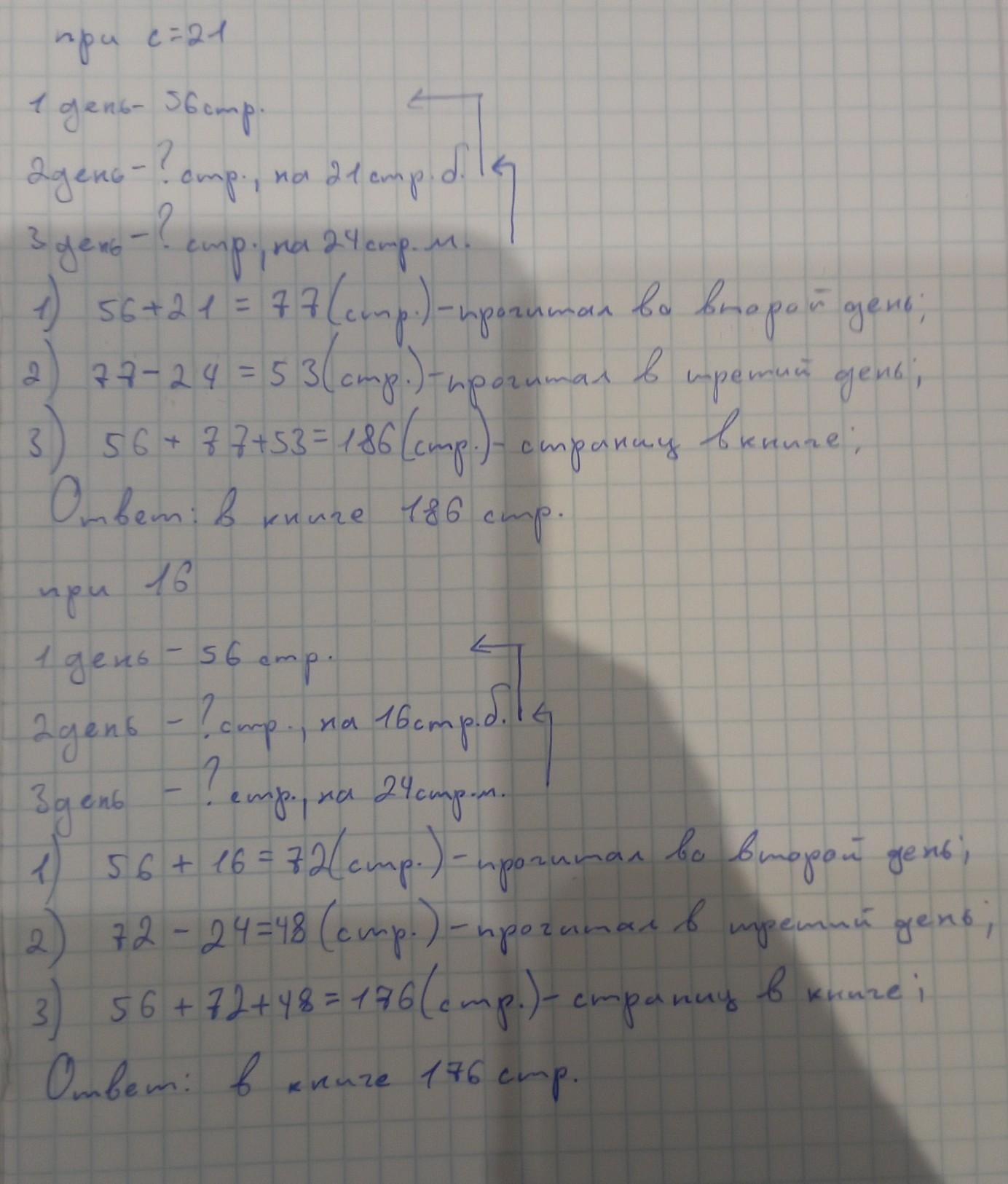 179.б) Алишер прочитал книгу за три дня. В первый день он прочитал 56 страниц, во второй день на с страниц больше, чем в первый, а в третий день 24 страницы меньше, чем во второй. Сколько страниц в книге? Решите задачу при с= 21;16.