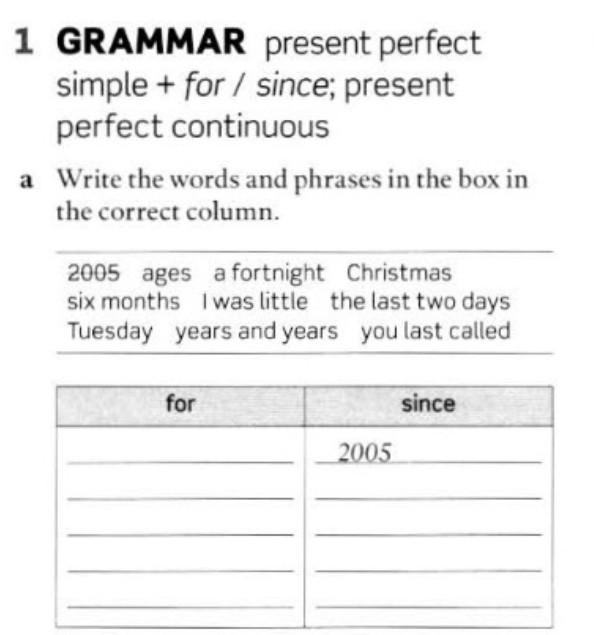 1 GRAMMAR present perfect simple + for / since; present perfect continuous a Write the words and phrases in the box in the correct column. 2005 ages a fortnight Christmas six months I was little the last two days Tuesday years and years you last called for 2005 since