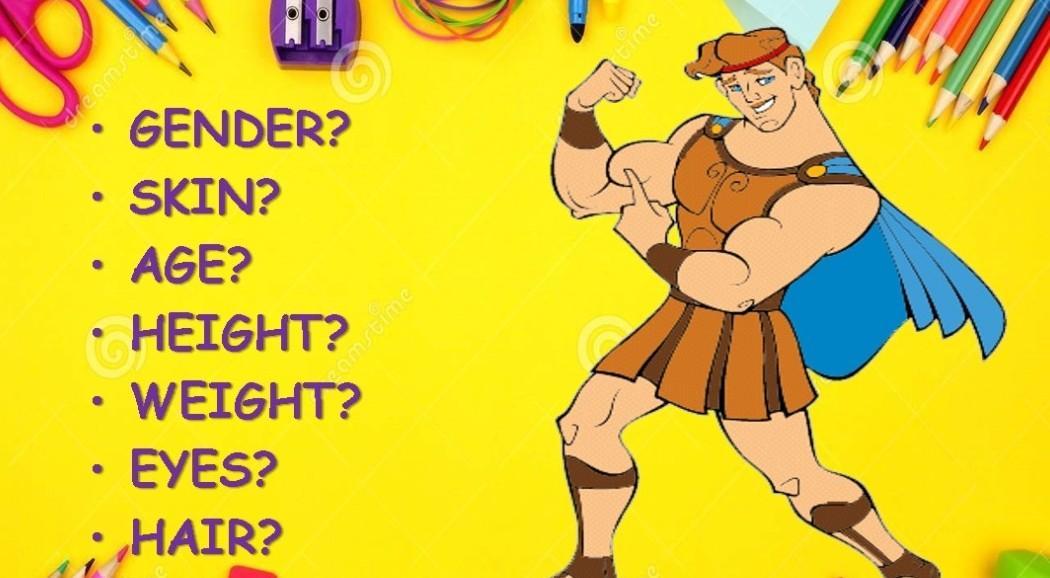 Ответ: Если описывать по вопросам с картинки, то - Tall, muscular man with light skin (age - ?) He has blue eyes and red hair. He has a blue cape and a hair tie