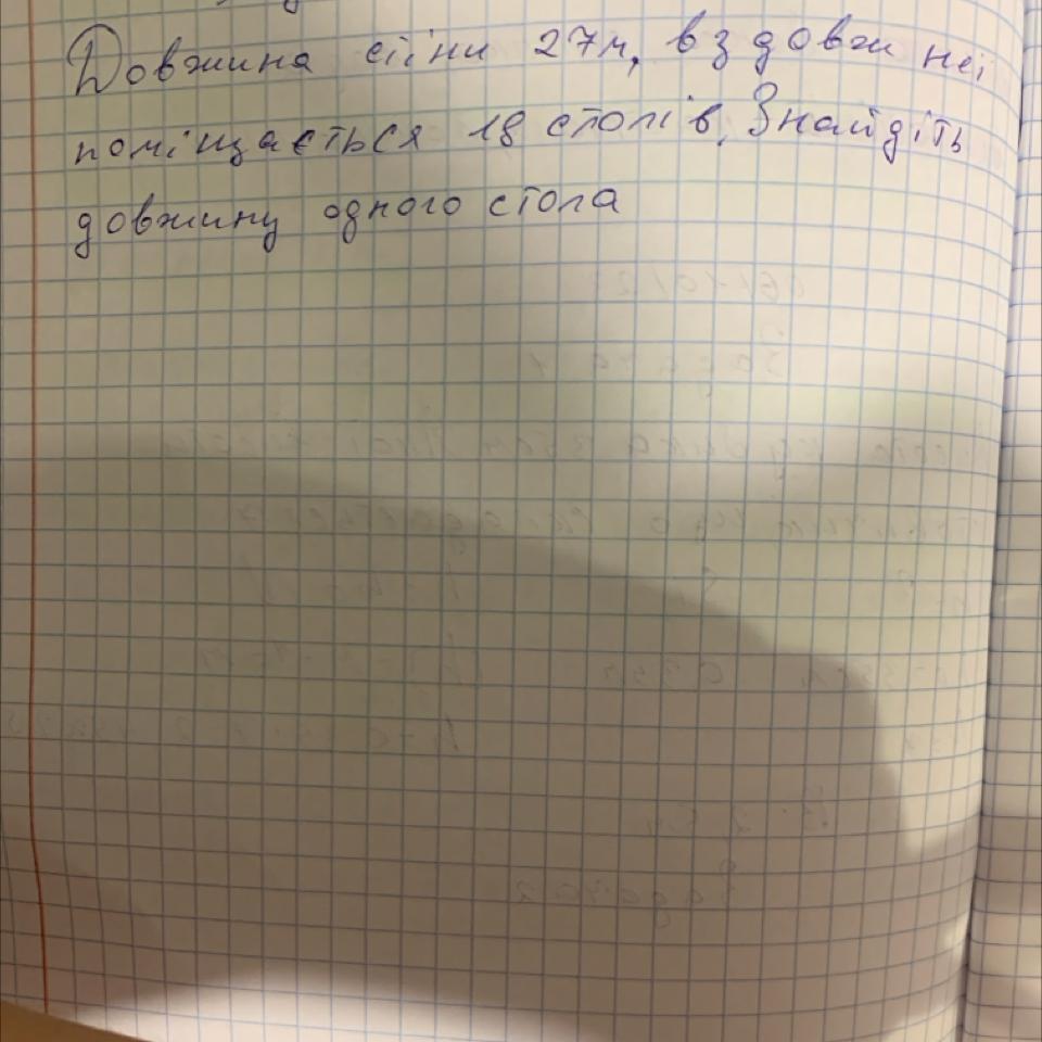 Для знаходження довжини одного стола, вам потрібно поділити загальну довжину стіни на кількість столів. У вас є 27 метрів стіни і 18 столів: