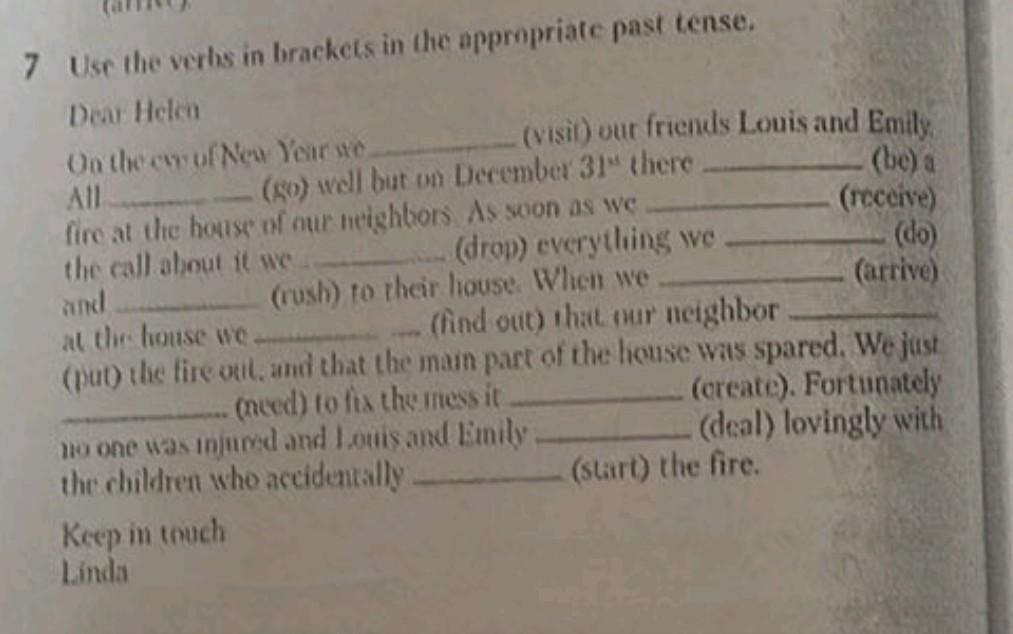 On the cusp of New Year, we (visited) our friends Louis and Emily. Everything (was) a blast until December 31st when a fire (broke) out at our neighbor's house. As soon as we (received) the call, we (dropped) everything and (rushed) to their house. When we (arrived) at the house, we (found) out that our neighbor (had put) the fire out, and that the main part of the house was spared. We just (needed) to fix the mess since no one was injured, and Louis and Emily, the children who accidentally (started) the fire, (dealt) lovingly with it. Fortunately, they (had dealt) with it responsibly.