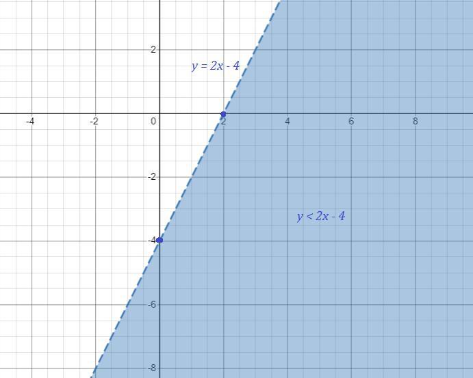 Так как на прямой у = 2х - 4 все точки имеют значения ординат "у" , равные " 2х - 4 " , то точки, у которых ординаты меньше " 2х - 4 " будут расположены ниже точек на прямой .