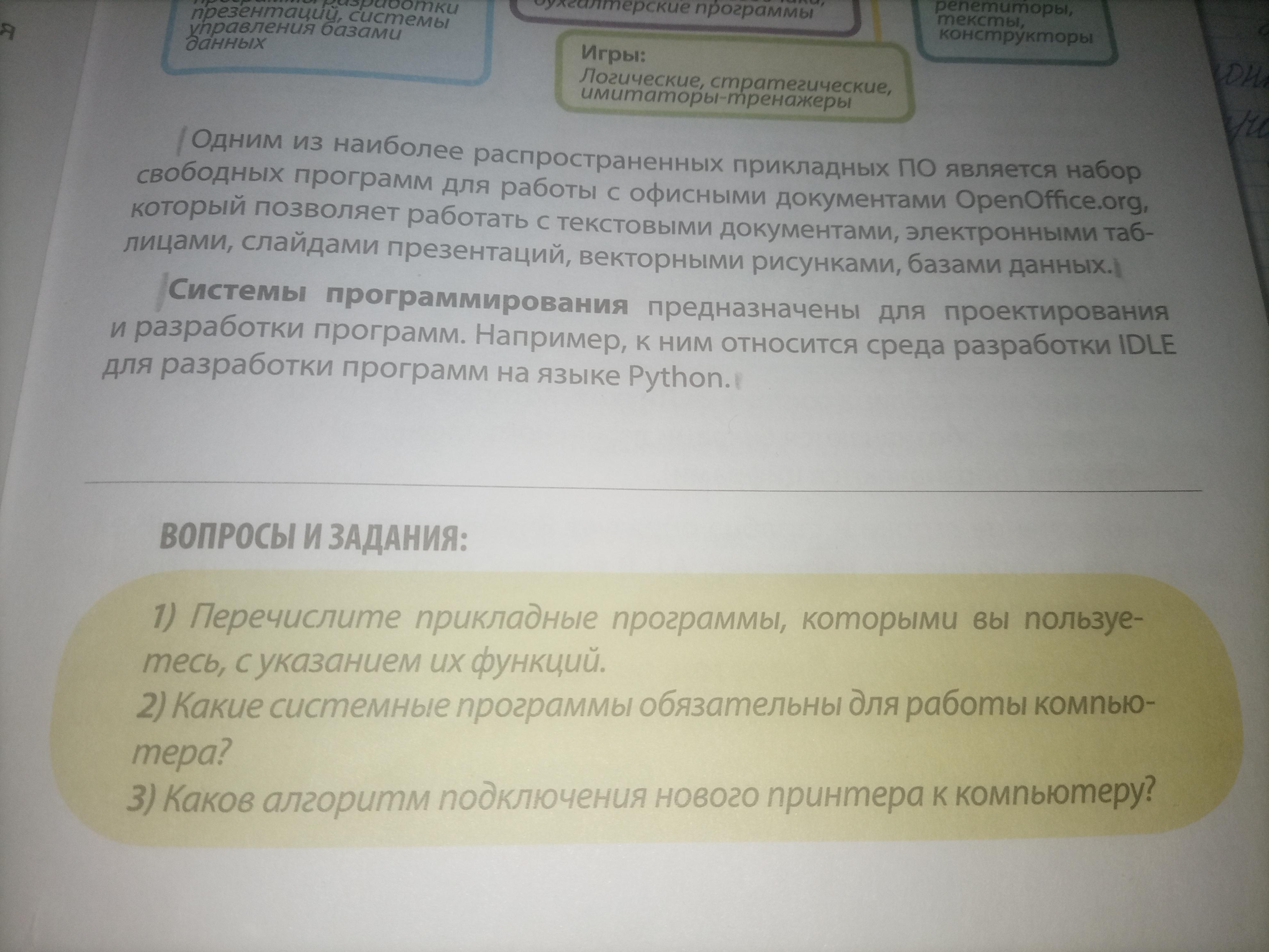 1) Перечислите прикладные программы, которыми вы пользуе- тесь, с указанием их функций. 2) Какие системные программы обязательны для работы компью- mepa? 3) Каков алгоритм подключения нового принтера к компьютеру?