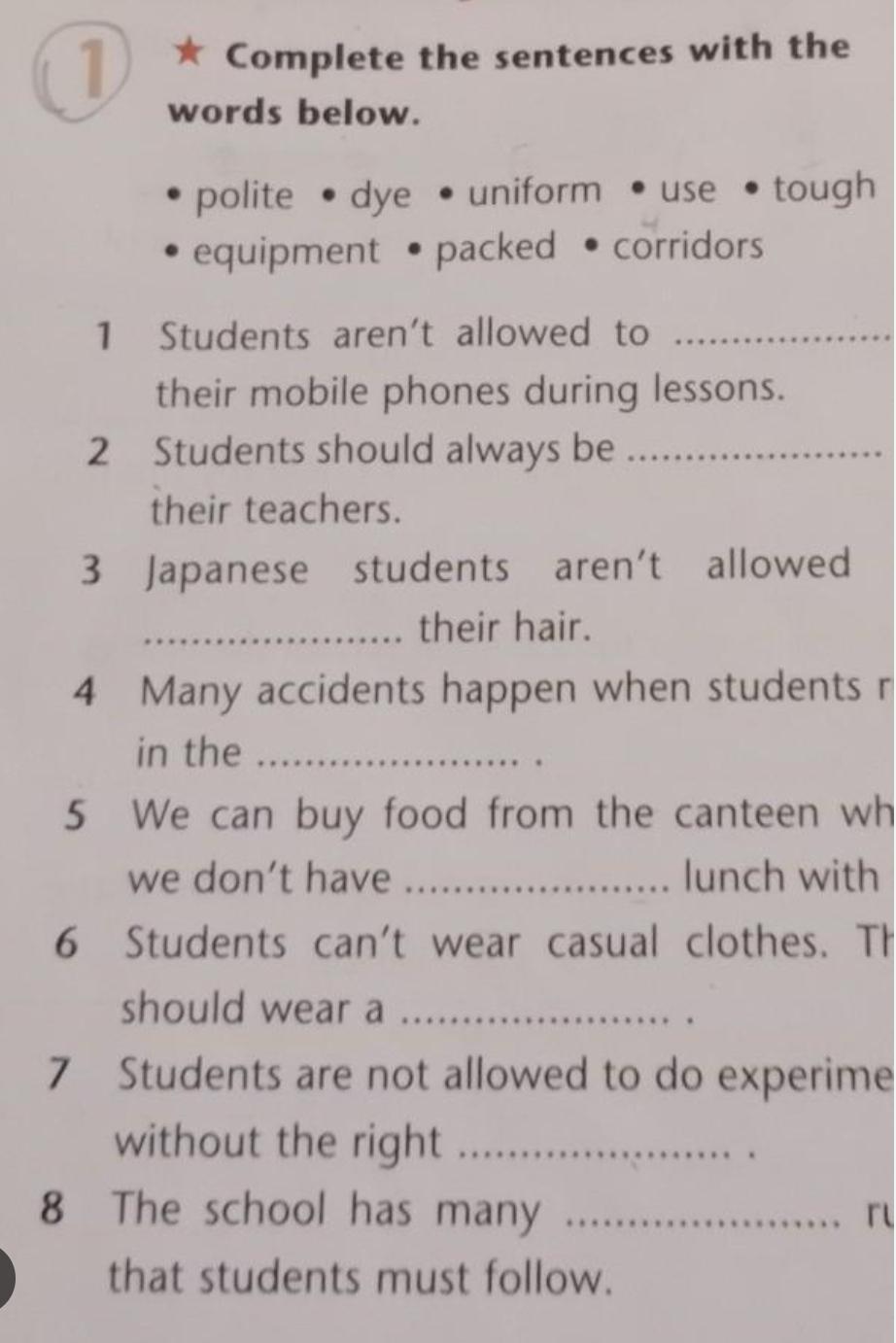 1use,2polite,3Dye,4corridors,5packet,6uniform,7equipment,8tought
