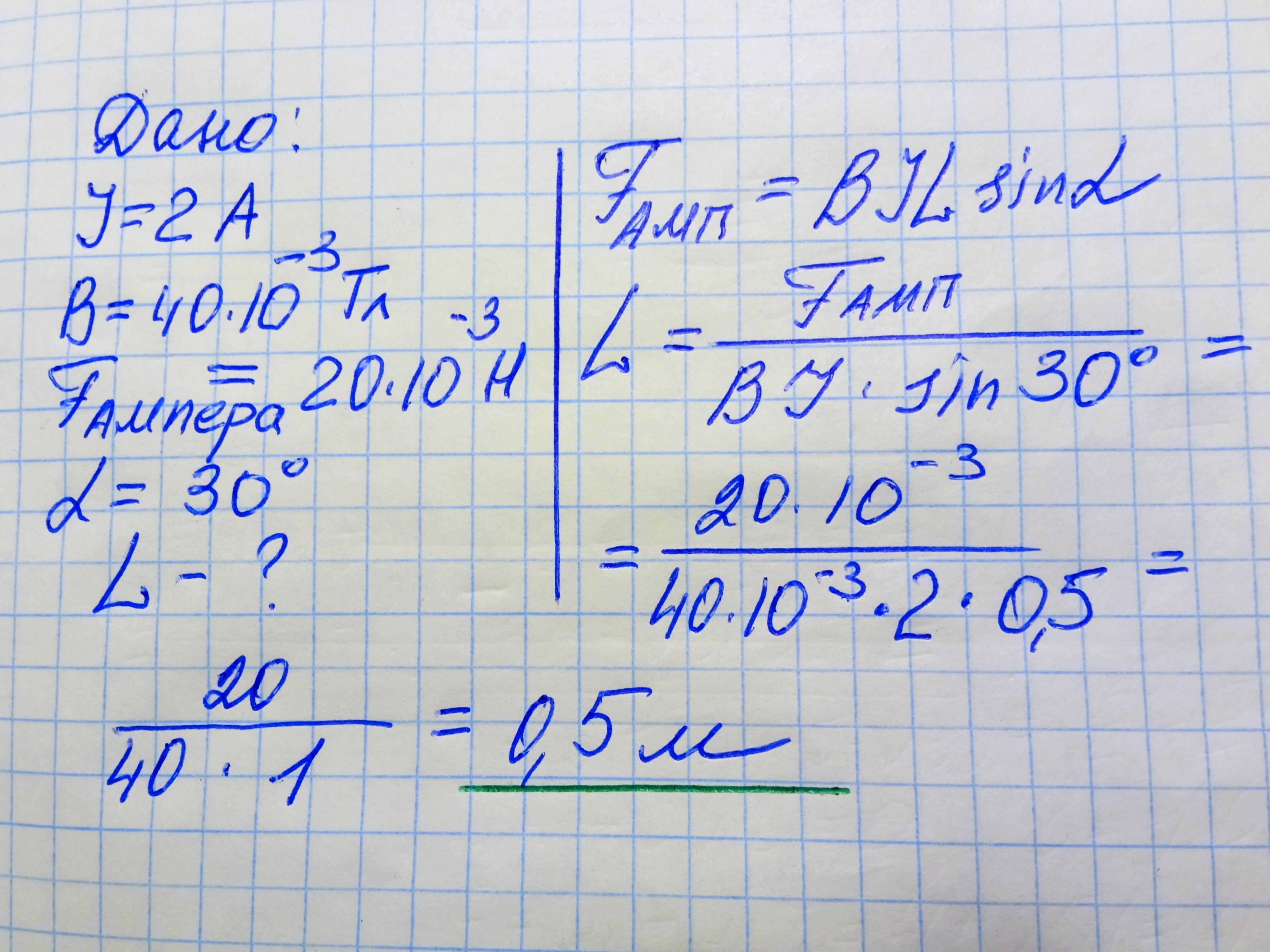 На прямолінійний провідник зі струмом 2 А в однорідному магнітному полі з індукцією 40 мТл діє сила 20 мН. Визначте довжину провідника, якщо він розташований під кутом 30° до ліній магнітної індукції?