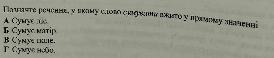 Позначте речення, у якому слово сумувати вжито у прямому значеннi А Сумує ліс. Б Сумує матір. в Сумує поле. Г Сумує небо.
