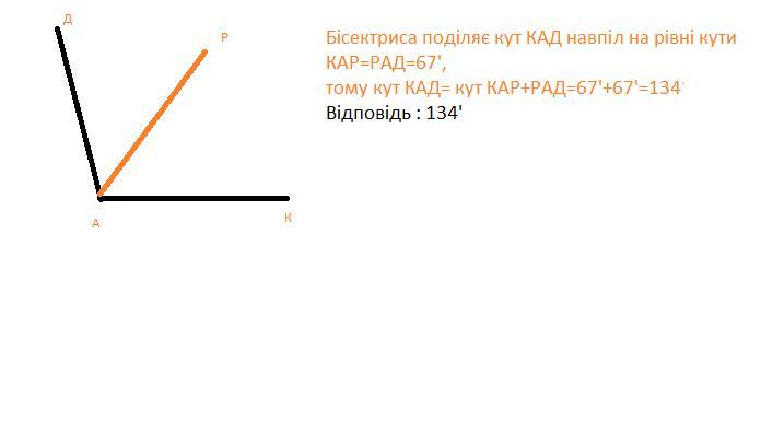 тому кут КАД= кут КАР+РАД=67'+67'=134'