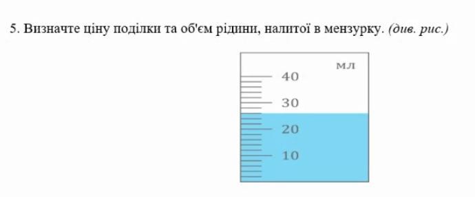 визначте ціну поділки та об'єм рідини, налитої в мензурку.