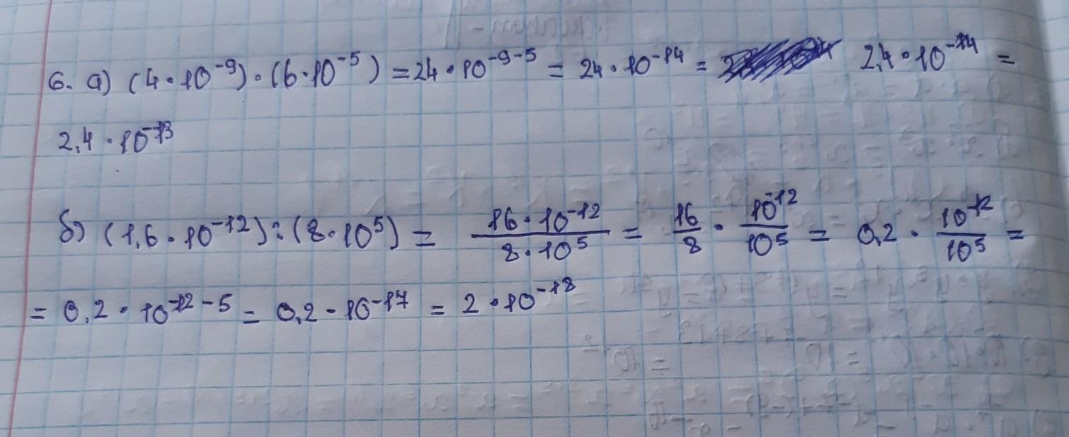 Виконай дії. Відповідь запиши в стандартному вигляді. А) (4 * 10-⁹)(6 * 10-⁵) = Б) (1, 6 * 10-¹²) / (8 * 10⁵) =