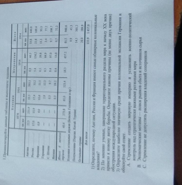 1. Проанализируйте данные таблицы и выполните задания Колении Метрополии Beero 3876 1914 1914 1914 ART жит м жит т 225 2519 33.3 17 A 393,5 332 03 465 33.8 440,0 870 15.9 54 1362 22.8 11.1 169 A 10.6 0.5 39.6 951 77.2 29 123 05 64.9 34 9.7 94 97.0 97 106,7 19,2 04 53,0 0,7 72,2 40.4 273.8 650 5234 16.5 437.2 815 960.6 остальных держав (Бельгия. Голланд 9.9 45.3 Полуколони (Персия, Катай. Турция) 145 361.2 Остальные 28.0 289,9 Для 1339 1657.0 1) Определите, почему Англия, Россия и Франция имеют самые обширные колониальные владения? 2) По мнению ученых, завершение территориального раздела мира к началу XX века привело к новому витку борьбы. Определите каковы причины (не менее двух причин) обострения международной ситуации. 3) Определите наиболее значимую среди причин колониальной экспансии Германии и обоснуйте свой ответ А. Стремление создать мировую империю и установить военно-политический контроль над стратегически важными регионами мира В. Экономические мотивы поиск рынков сбыта и источников сырья С. Стремление не допустить расширения владений соперников