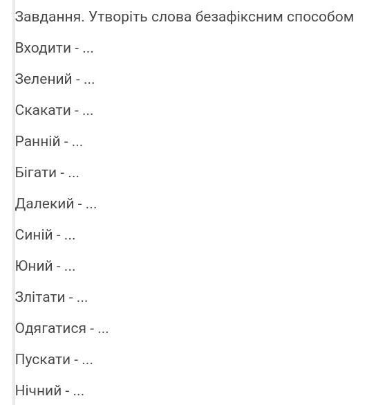 Завдання. Утворіть слова безафіксним способом Входити -... Зелений -... Скакати - Ранній - ... --- Бігати -... Далекий .... Синій -... Юний -... Злітати- Одягатися -... Пускати.... ... Нiчний -...