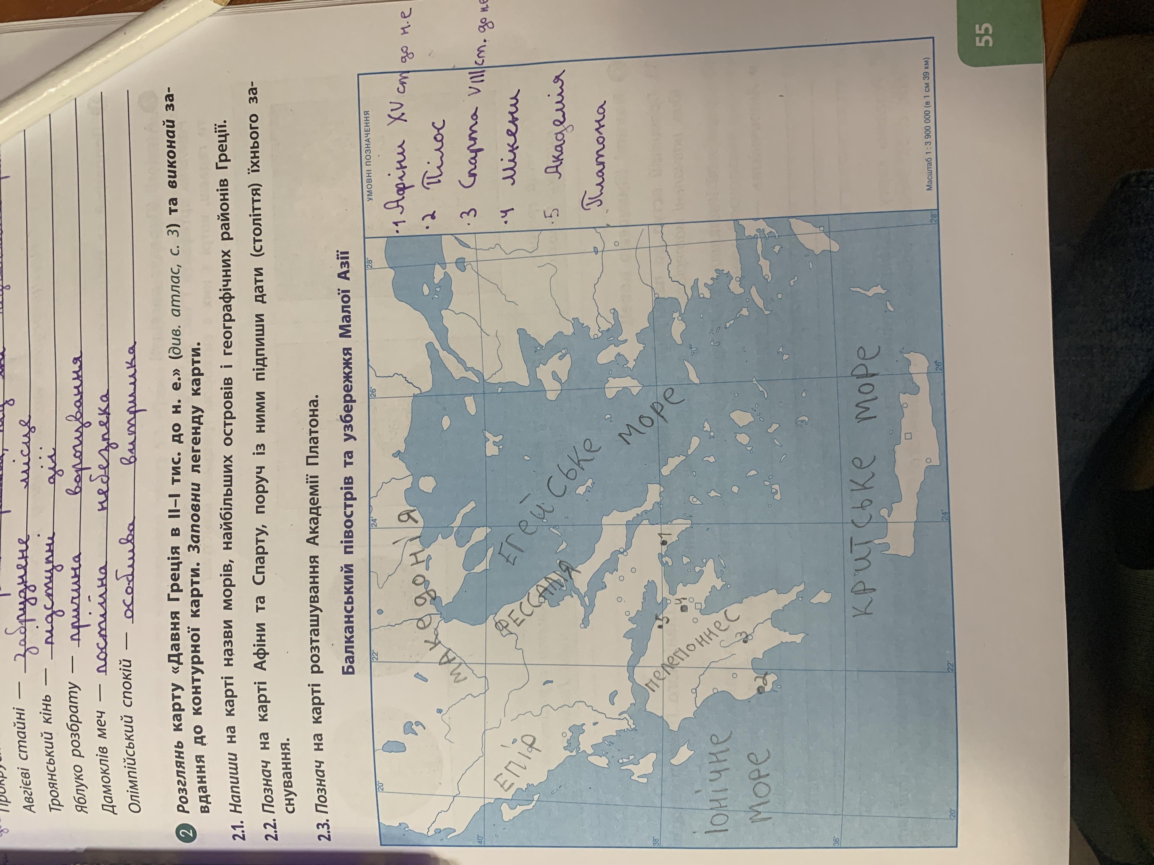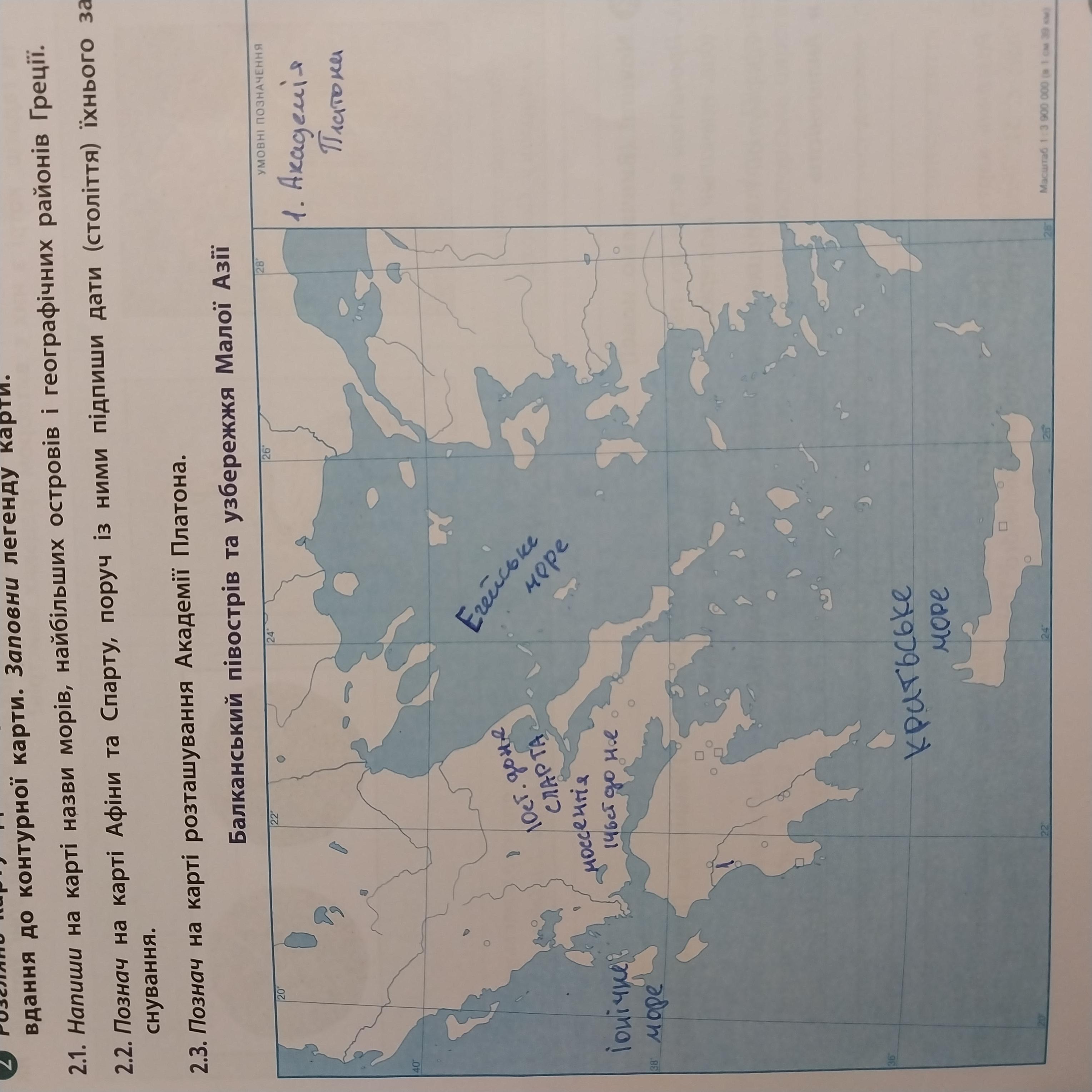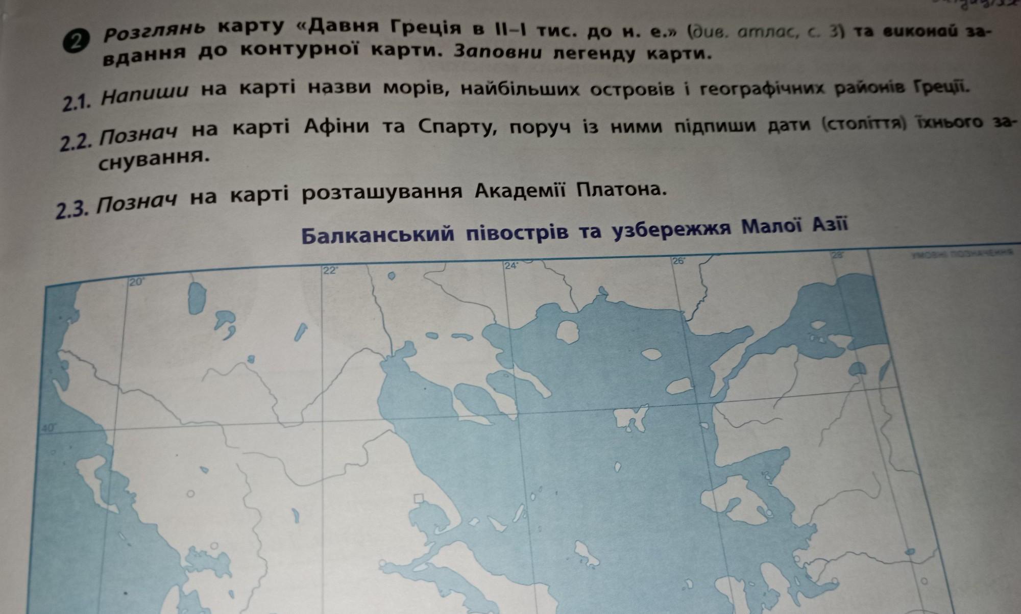 Розглянь карту «Давня Греція в 11-1 тис. до н. е.» (див. атлас. с. 3) та виконай за- вдання до контурної карти. Заповни легенду карти. 2.1. Напиши на карті назви морiв, найбільших островів і географічних районів Греції. 2.2. Познач на карті Афіни та Спарту, поруч із ними підпиши дати (століття) їхнього за- снування. 2.3. Познач на карті розташування Академії Платона.