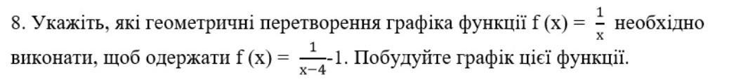 Щоб одержати графік функції f(x) = 1/(x - 4) - 1 з графіка функції f(x) = 1/x, потрібно виконати наступні геометричні перетворення: