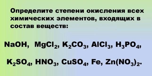 Определите степени окисления всех химических элементов, входящих в состав веществ: NaOH, MgCl2, К2СО3, AlCl3, H3PO4, K2SO4, HNO3, CuSO4, Fe, Zn(NO3)2.