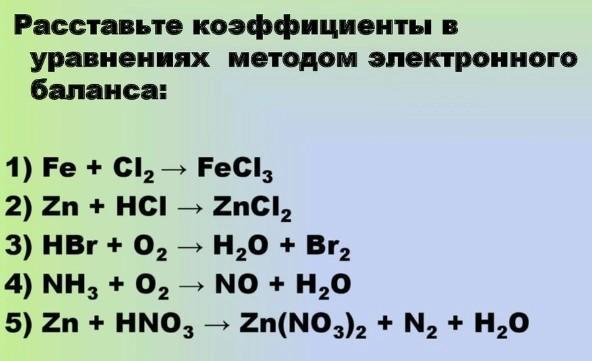 Расставьте коэффициенты в уравнениях методом электронного баланса: 1) Fe + Cl2 → FeCl3 2) Zn + HCl → ZnCl2 3) HBr + O2 → H2O + Br2 4) NH3 + O2 → NO + H2O 5) Zn + HNO3 - Zn(NO3)2 + N2 + H2O